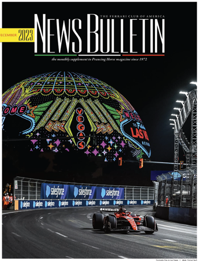 NEWS BULLETIN is the monthly full-color digital news and classifieds magazine of the Ferrari Club of America. Issues will typically include a section on Ferrari vehicles, vintage Ferrari literature, or other features of particular interest to FCA members. Also included are full FCA regional and chapter event calendars and display fliers for most FCA-hosted events throughout all of North America. Our multi-sectional classified marketplace for Ferrari related cars, products, and a wide variety of Ferrari-related features, has been the most trusted FCA resource since 1972. Each issue is designed and illustrated to the highest graphic standards.